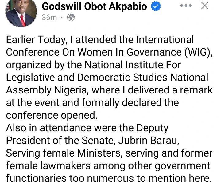 Godswill Obot Akpabio said on his verified Facebook page; “Earlier Today, I attended the International Conference On Women In Governance (WIG), organized by the National Institute For Legislative and Democratic Studies National Assembly Nigeria, where I delivered a remark at the event and formally declared the conference opened.”