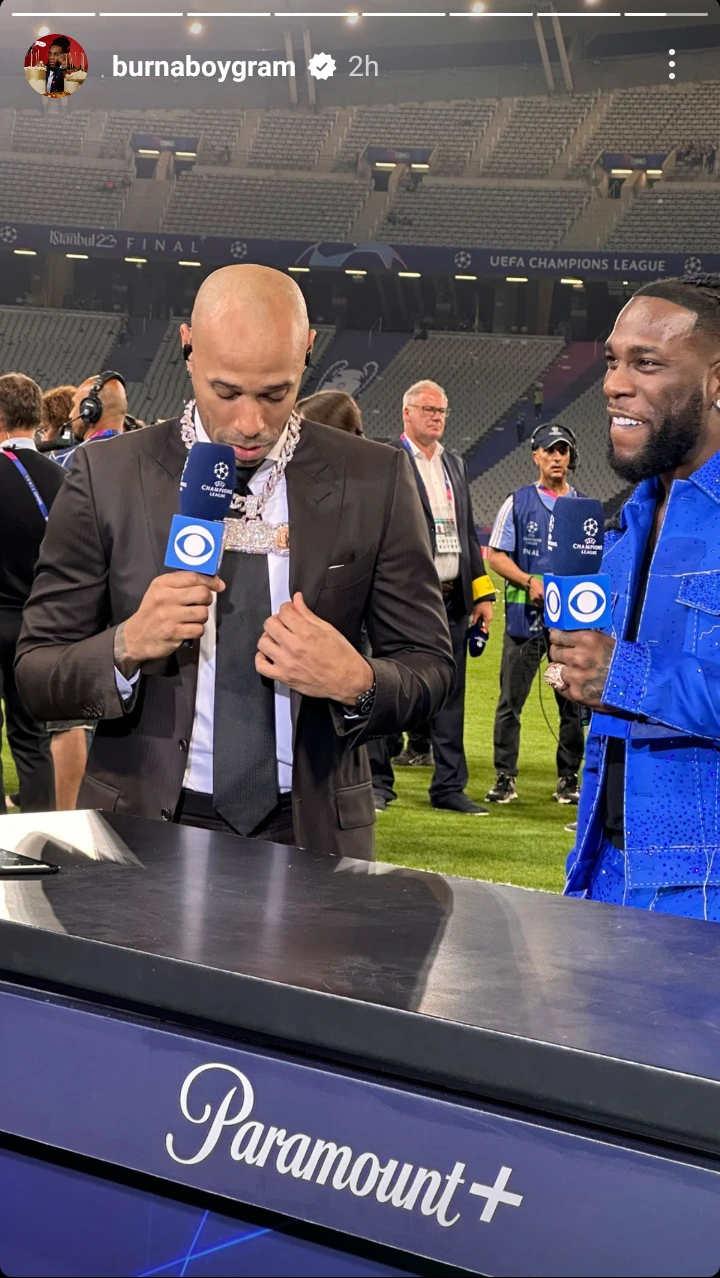 Nigerian Singer and songwriter, Damini Ebunoluwa Ogulu popularly known as Burna Boy has taken to social media to share Photo of former Arsenal, Barcelona and French legendary attacker, Thierry Henry wearing his ‘Gambo ‘diamond’ necklace last night after the UEFA Champions League final between Manchester City and Inter Milan at Istanbul, Turkey.