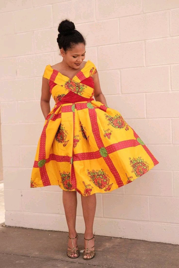 Utilizing Ankara fabric, you can fashion an off-the-shoulder dress complete with pockets, combining functionality and allure. Opting for a length that falls just above or at the knee while designing your Ankara dress is an excellent way to emanate confidence and energy. Complement the ensemble with bold jewelry and high heels to elevate your presence.