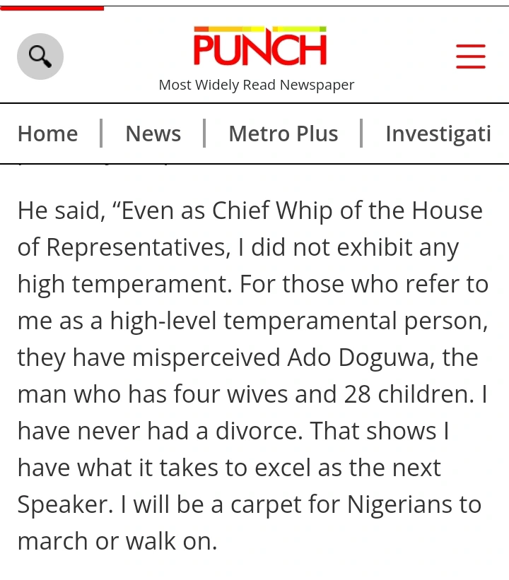 He said, “Even as Chief Whip of the House of Representatives, I did not exhibit any high temperament. For those who refer to me as a high-level temperamental person, they have misperceived Ado Doguwa, the man who has four wives and 28 children. I have never had a divorce. That shows I have what it takes to excel as the next Speaker. I will be a carpet for Nigerians to march or walk on.