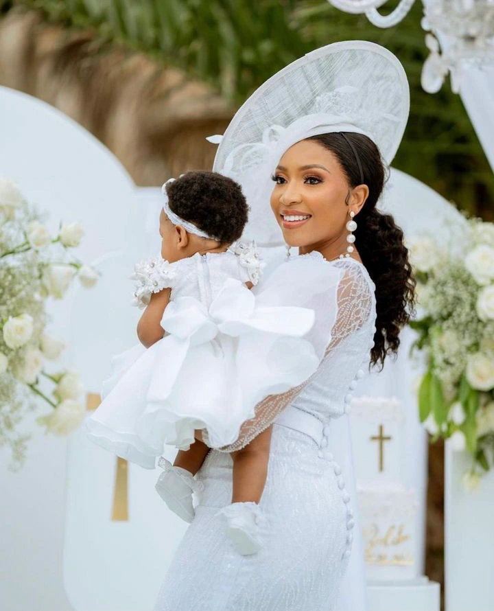 Model Blue Mbombo has a one-year-old daughter named Zalika. She shared on Instagram that when the little girl went to her christening, she wore a white dress with a bit of lace and a headband, while she also wore a lacy white dress with a white hat.